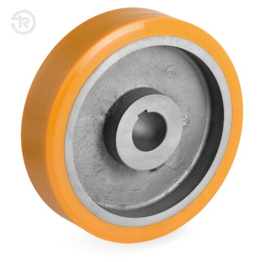Räder aus "TR" Polyurethan, Härte 92 Shore A, mit Felge aus Gusseisen, mit Keilnut. Die von Tellure Rôta für die Konstruktion der Keilnut verwendete Standard-Referenznorm ist UNI EN 6604-69; daher beträgt die