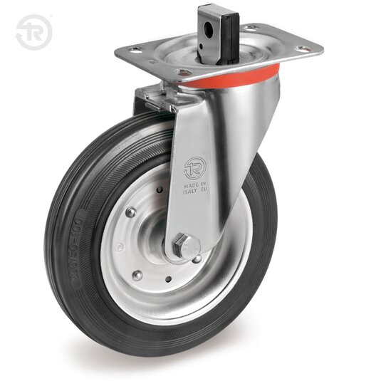 Laufbelag: Schwarzes Standardgummi, Härte 80 Shore A. Felge: aus zwei galvanisch verzinkten und vernieteten Stahlblech-Scheiben.