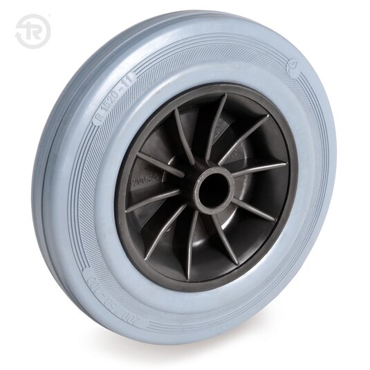 Laufbelag bestehend aus einem aufgezogenen abriebfesten Standard-Gummiring; Härte 80 Shore A. Polypropylenkern.