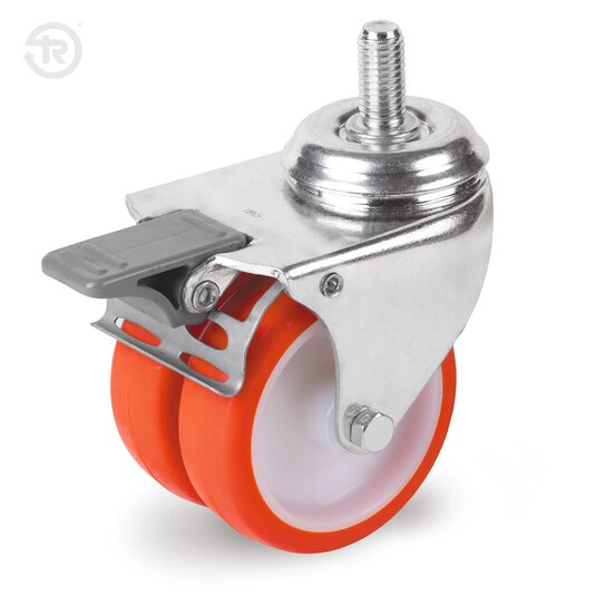 Gehäuse bestehend aus Platte, kugellagerhaltescheibe und Gabel aus galvanisch verzinktem Stahlblech. Die Lenkdrehung besteht aus zwei fettgeschmierten Kugellaufbahnen, die durch die besondere Form der Befestigungsplatte geschützt sind. Der zentrale Stahlbolzen ist durch Stanzen gefertigt und vernietet.