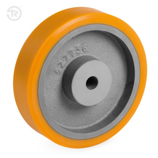 "TR" Polyurethan-Räder, Gusseisenkern. Diese Räder können auch als Antriebsräder benutzt werden: die Radnabe ist so beschaffen, dass sie leicht bearbeitet werden kann, um einen Keilsitz oder die Aufnahme für einen Keilverbinder herstellen zu können.