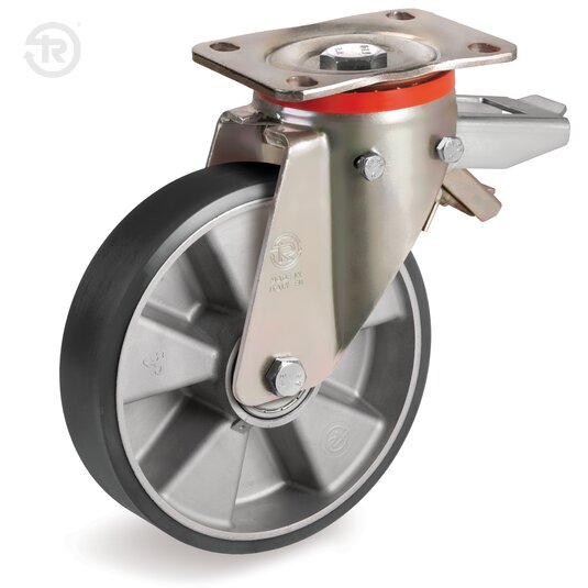 Supporto costituito da piastra, anello tenuta sfere e forcella in lamiera d'acciaio zincato giallo elettroliticamente ; organo di rotazione formato da due giri sfere lubrificati a grasso e protezione con anello parapolvere in poliammide 6. Perno centrale composto da vite classe 8.8 e dado. Il freno registrabile consente il bloccaggio della ruota e del supporto.