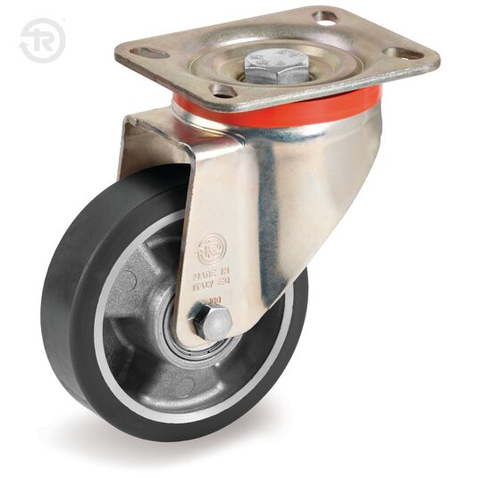 Supporto costituito da piastra, anello tenuta sfere e forcella in lamiera d'acciaio zincato giallo elettroliticamente ; organo di rotazione formato da due giri sfere lubrificati a grasso e protezione con anello parapolvere in poliammide 6. Perno centrale formato da vite classe 8.8 e dado.