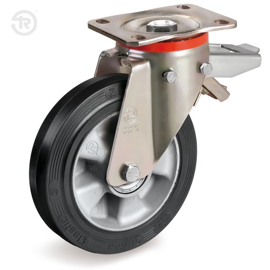 Gehäuse bestehend aus Platte, kugellagerhaltescheibe und Gabel aus elektrolytisch gelb verzinktem Stahlblech. Die Lenkdrehung besteht aus zwei fettgeschmierten Kugellaufbahnen mit Staubschutzring aus Polyamid 6. Zentraler Bolzen bestehend aus Schraube Klasse 8.8 und Mutter. Mit der einstellbaren Bremse können das Rad und das Gehäuse festgestellt werden.
