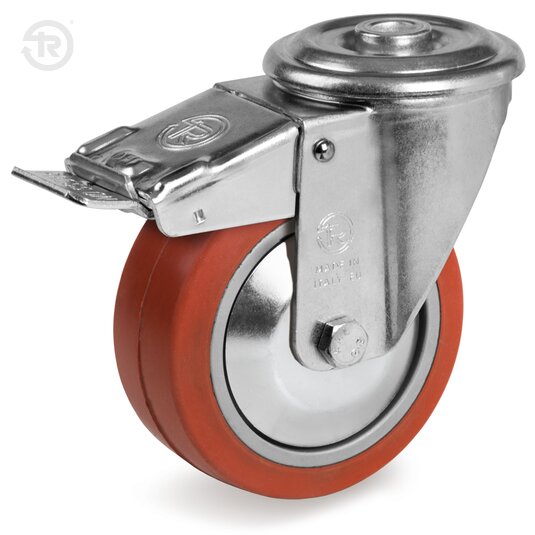 Rotgefarbene, schmutzabweisende Silikongummi-Räder. Härte 80+/-5 Shore A, Aluminiumkern.