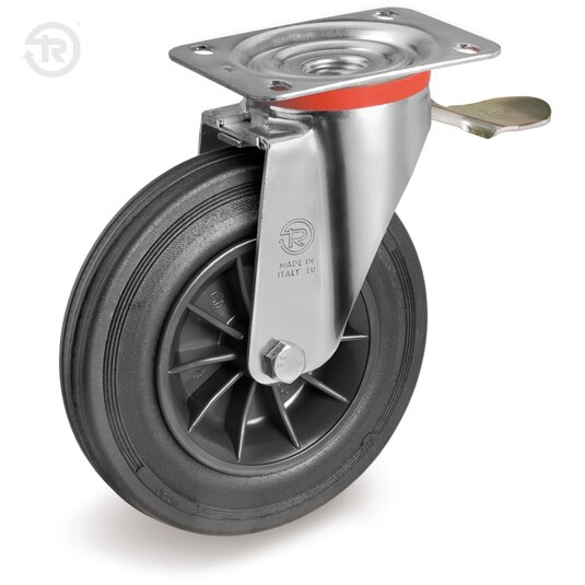 Swivel top plate bracket type NL. The plate, the ball rice ring and the fork are of pressed steel zinc plated finish; swivel actions: double ball greased race with dust protection seal made of polyethilene. The king pin is integral with top plate and duly rivetted. The rear brake is necessary to lock wheel and top plate rotation.