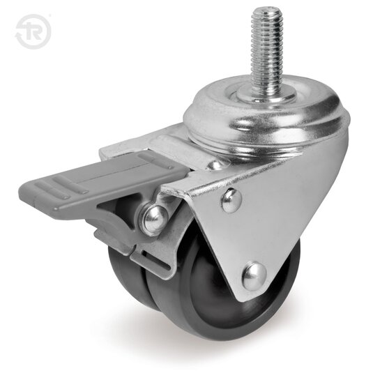 Swivel top plate bracket. The plate, the ball rice ring and the fork are made of pressed steel zinc plated finish; swivel actions: double ball greased race with dust protection granted by the particular plate configuration. The king pin is integral with the top plate and duly rivetted.