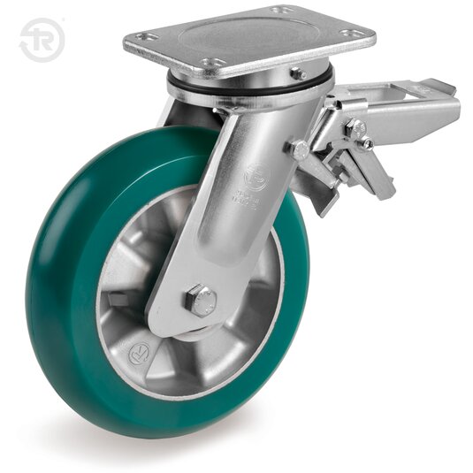 TR-ROLL polyurethane wheels with ergonomic round profile, hardness 75 Shore A; core made of cast aluminium.