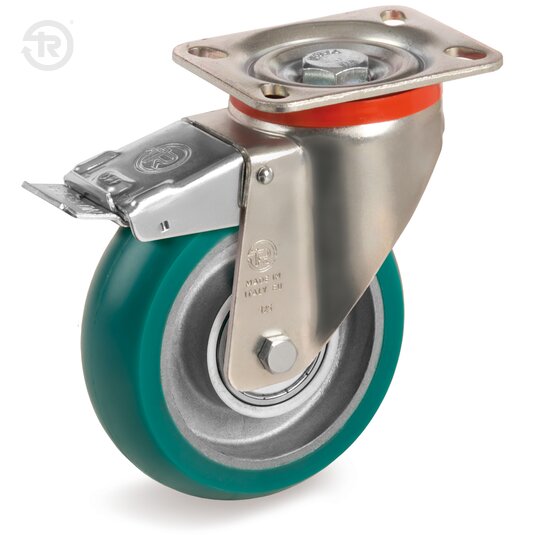 Swivel top plate bracket type P. The plate, the ball race ring and the fork are made of pressed yellow galvanised steel plate; swivel actions: double ball greased race with dust protection seal made of polyamide 6. The king pin is made of steel bolt 8.8 and nut series. The brake locks wheel and top plate rotation.