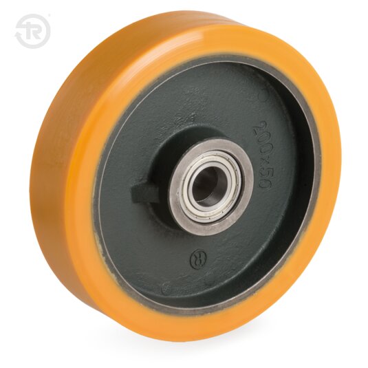 TR polyurethane tread; hardness 92 +/-3 Shore A. Cast iron centre.