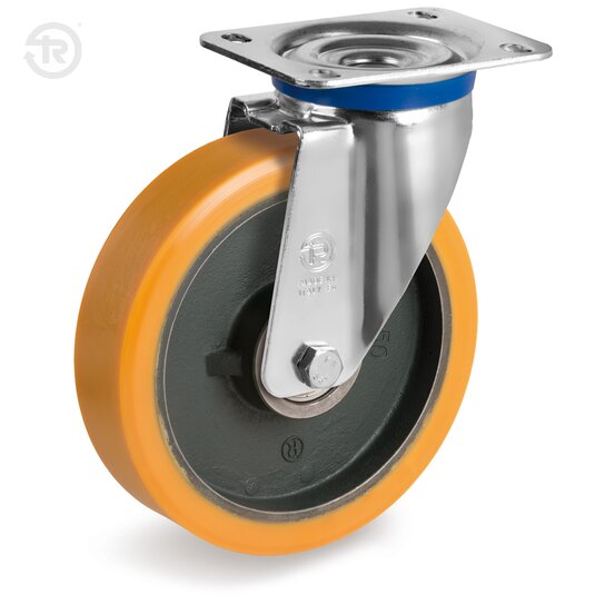 TR polyurethane tread; hardness 92 +/-3 Shore A. Cast iron centre.