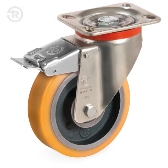 TR polyurethane tread; hardness 92 +/-3 Shore A. Cast iron centre.