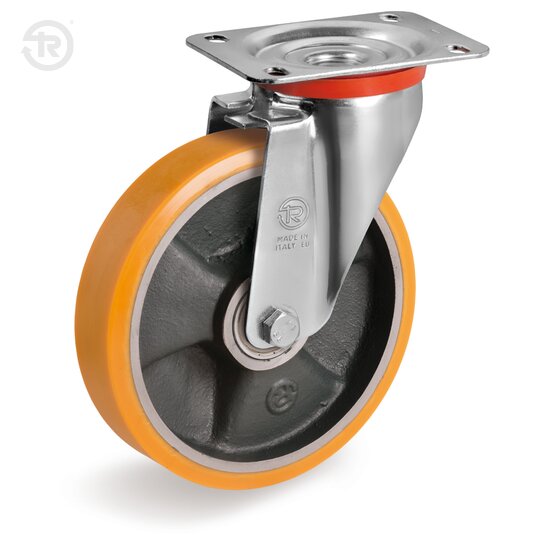 TR polyurethane tread; hardness 92+/-3 Shore A. Cast iron centre.