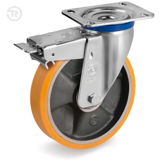 TR polyurethane tread; hardness 92+/-3 Shore A. Cast iron centre.
