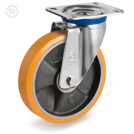 TR polyurethane tread; hardness 92+/-3 Shore A. Cast iron centre.