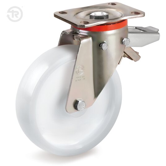 Swivel top plate bracket type P. The plate, the ball rice ring and the fork are made of pressed yellow galvanised steel plate; swivel actions: double ball greased race with dust protection seal made of polyamide 6. The king pin is made of steel bolt 8.8 and nut series. The adjustable brake locks wheel and top plate rotation.