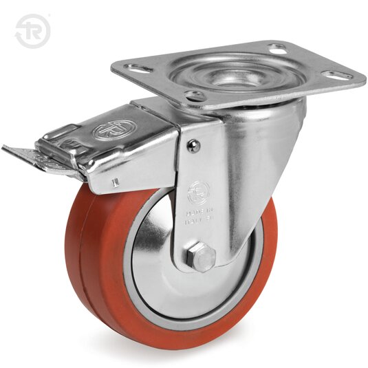 Swivel top plate bracket type NL. The plate, the ball race ring and the fork are of pressed steel zinc plated finish; swivel actions: double ball greased race. The king pin is integral with top plate and duly rivetted. The front brake is necessary to lock wheel and top plate rotation.
