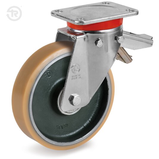Soporte formado por pletina y horquilla en chapa de acero cincado; órgano de rotación formado por un cojinete de empuje ELP y un cojinete de rodillos cónicos y protección con anillo guardapolvo en polietileno. Perno central integral con la pletina conseguido por torneado y roscado y fijado con tuerca autoblocante. El freno registrable permite el bloqueo de la rotación de rueda y soporte.