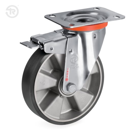 Soporte constituido por pletina, anillo retención bolas y horquilla en acero inox AISI 304; órgano de rotación formado por dos vueltas de bolas INOX con lubricación con grasa. Perno central integral con la pletina conseguido por moldeado y ensamblado por remachado. El freno delantero en acero inox AISI 304 permite el bloqueo del soporte y de la rueda.