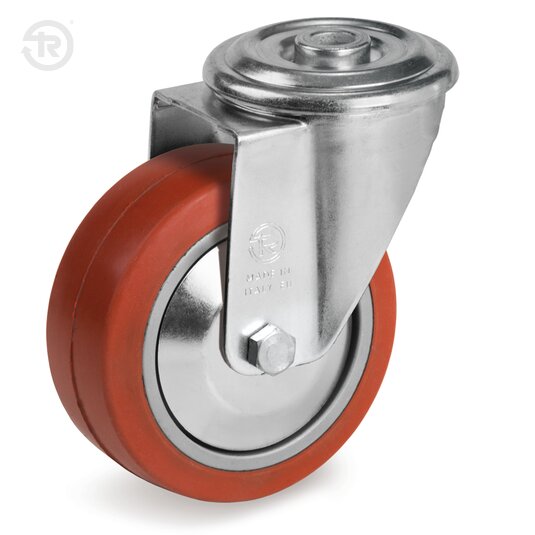 Ruedas de goma silicónica antimancha de color rojo, dureza 80+/-5 Shore A, núcleo de aluminio.