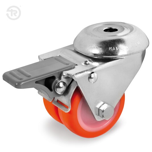 Roues jumelées en polyuréthane injecté, corps en polyamide 6, monture pivotante à oeil avec haute capacité de charge avec frein