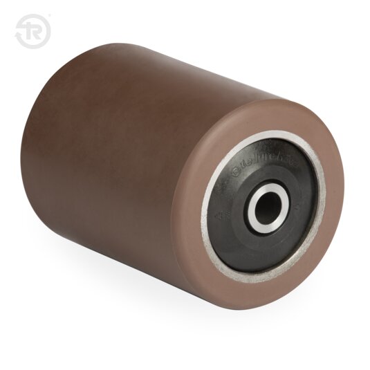 Bandage en polyuréthane coulé TR-PowerHigh; dureté 92+/-3 Shore A. Corps obtenu par un tube en acier avec labyrinthes et tube d'essieu, anneaux de protection en matière plastique avec lèvre intégrée, enchâssés par interférence devant les roulements à billes.