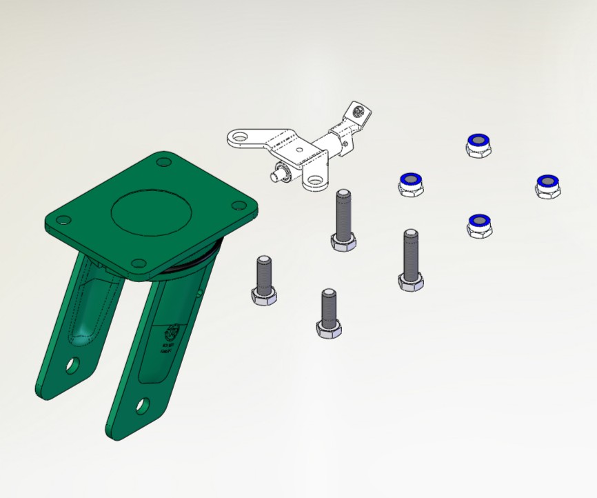 Realizzato per il fissaggio sul lato corto della piastra, è composto da particolari in acciaio zincato ed è idoneo per carrelli con traino meccanizzato a velocità fino a 16 km/h su pavimentazione da interno e da esterno (asfalto, cemento). Per facilitarne l’utilizzo, è dotato della funzione di auto inserimento nell’intaglio di direzionamento ruota presente sulla forcella dei supporti rotanti. Caratteristiche:
