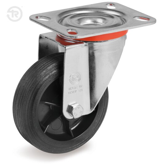 Supporto costituito da piastra, anello tenuta sfere e forcella in lamiera di acciaio zincato elettroliticamente; organo di rotazione formato da due giri sfere lubrificati a grasso e protezione con anello parapolvere in polietilene. Perno centrale integrale con la piastra ottenuto da stampaggio ed assemblato per ribaditura.