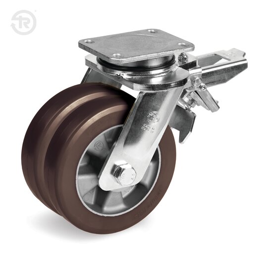 Supporto costituito da piastra in acciaio forgiato con perno integrato, forcella con orecchie imbutite elettrosaldate alla flangia, organi di rotazione composti da un cuscinetto assiale a sfere e un cuscinetto a rulli conici, ingrassatore e sistema di anti-allentamento del dado di bloccaggio. Freno posteriore registrabile: un'azione sulla regolazione del freno varia l'efficienza di frenatura del prodotto.