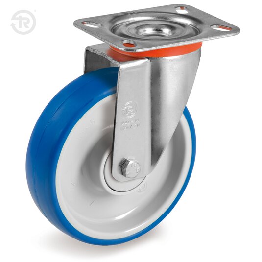 Supporto costituito da piastra, anello tenuta sfere e forcella in lamiera di acciaio zincato elettroliticamente; organo di rotazione formato da due giri sfere lubrificati a grasso e protezione con anello parapolvere in polietilene. Perno centrale integrale con la piastra ottenuto da stampaggio ed assemblato per ribaditura.