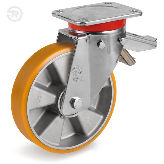Supporto costituito da piastra e forcella in lamiera d'acciaio zincato; organo di rotazione formato da un cuscinetto a spinta ELP e un cuscinetto a rulli conici e protezione con anello parapolvere in polietilene. Perno centrale integrale con la piastra ottenuto da tornitura e filettatura e fissato con dado autobloccante. Il freno registrabile consente il bloccaggio della rotazione di ruota e supporto.