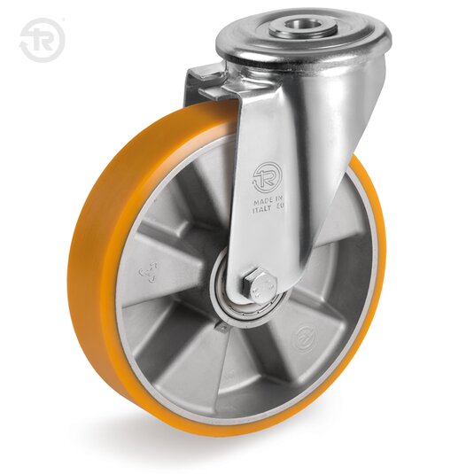Rivestimento in poliuretano colato "TR"; durezza 92+/-3 Shore A. Nucleo in alluminio pressofuso.