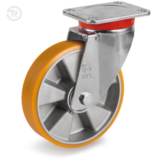 Rivestimento in poliuretano colato "TR"; durezza 92+/-3 Shore A. Nucleo in alluminio pressofuso.