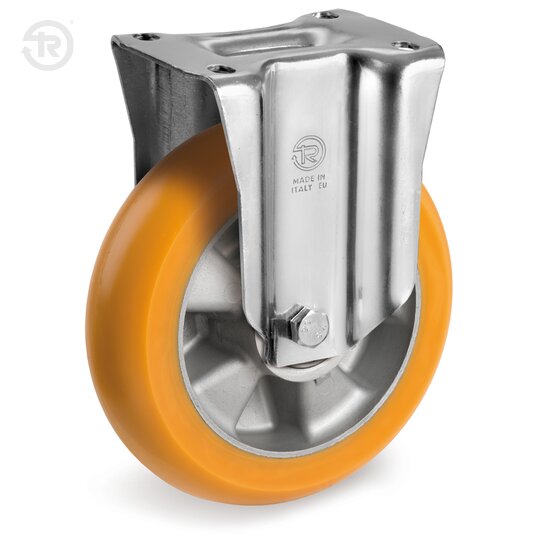 Ruote in poliuretano TR con profilo bombato ergonomico, durezza 92+/-3 Shore A; nucleo in alluminio pressofuso.