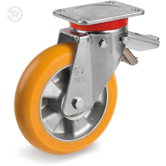 Supporto costituito da piastra e forcella in lamiera d'acciaio zincato; organo di rotazione formato da un cuscinetto a spinta ELP e un cuscinetto a rulli conici e protezione con anello parapolvere in polietilene. Perno centrale integrale con la piastra ottenuto da tornitura e filettatura e fissato con dado autobloccante. Il freno registrabile consente il bloccaggio della rotazione di ruota e supporto.