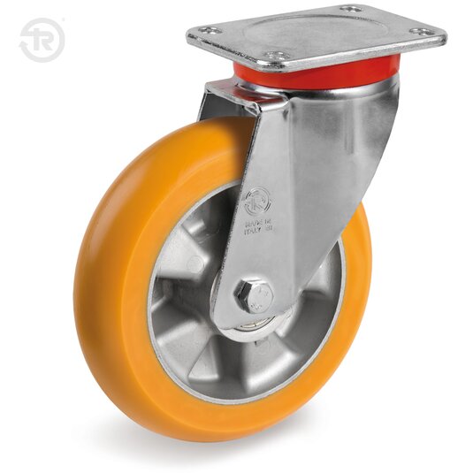 Ruote in poliuretano TR con profilo bombato ergonomico, durezza 92+/-3 Shore A; nucleo in alluminio pressofuso.