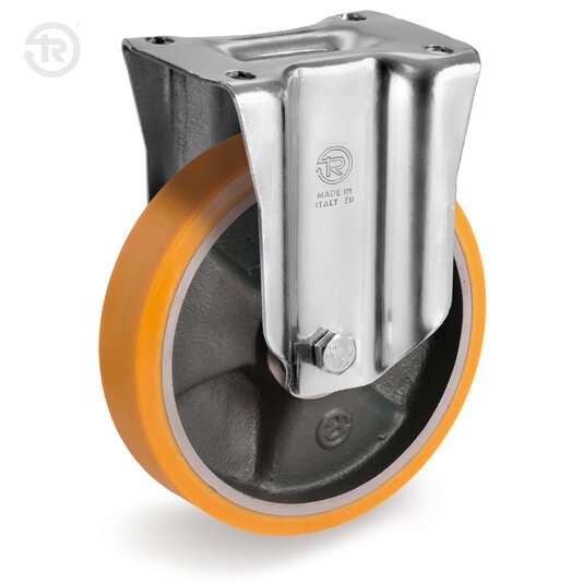 Rivestimento in poliuretano colato "TR"; durezza 92+/-3 Shore A. Nucleo in ghisa meccanica.