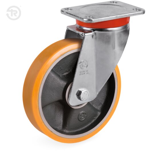 Supporto costituito da piastra e forcella in lamiera d'acciaio zincato; organo di rotazione formato da un cuscinetto a spinta ELP e un cuscinetto a rulli conici e protezione con anello parapolvere in polietilene. Perno centrale integrale con la piastra ottenuto da tornitura e filettatura e fissato con dado autobloccante.