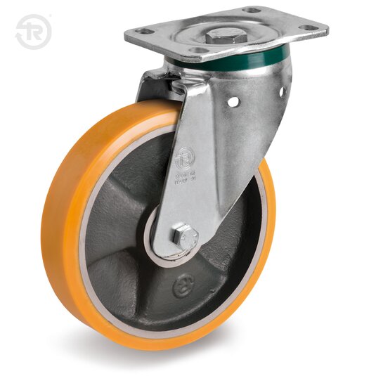 Rivestimento in poliuretano colato "TR"; durezza 92+/-3 Shore A. Nucleo in ghisa meccanica.