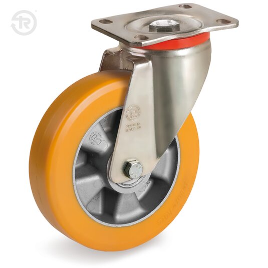 Rivestimento in poliuretano colato "TR", alto spessore; durezza 92+/-3 Shore A. Nucleo in alluminio pressofuso.