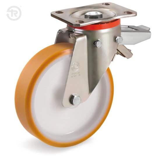 Supporto costituito da piastra, anello tenuta sfere e forcella in lamiera d'acciaio zincato giallo elettroliticamente ; organo di rotazione formato da due giri sfere lubrificati a grasso e protezione con anello parapolvere in poliammide 6. Perno centrale composto da vite classe 8.8 e dado. Il freno registrabile consente il bloccaggio della ruota e del supporto.