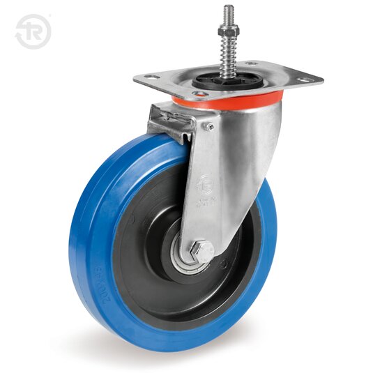 Supporto costituito da piastra, anello tenuta sfere e forcella in lamiera di acciaio zincato elettroliticamente; organo di rotazione formato da due giri sfere lubrificati a grasso e protezione con anello parapolvere in polietilene. Perno centrale integrale con la piastra ottenuto da stampaggio ed assemblato per ribaditura. Freno centralizzato attivo, normalmente azionato in fase di riposo.