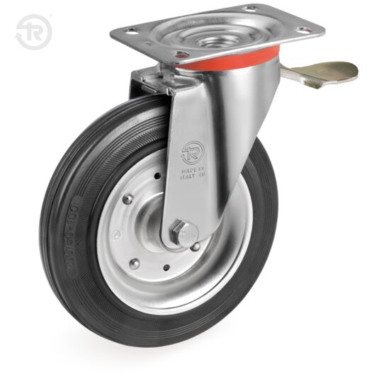 Supporto costituito da piastra, anello tenuta sfere e forcella in lamiera di acciaio zincato elettroliticamente; organo di rotazione formato da due giri sfere lubrificati a grasso e protezione con anello parapolvere in polietilene. Perno centrale integrale con la piastra ottenuto da stampaggio ed assemblato per ribaditura. Il freno posteriore in lamiera di acciaio zincato elettroliticamente consente il bloccaggio del supporto e della ruota.