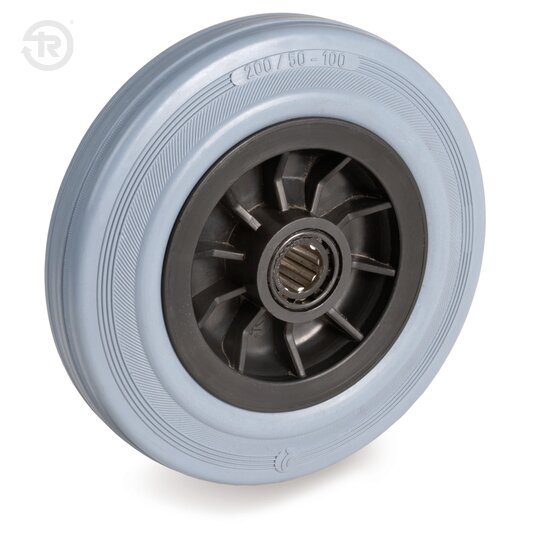 Rivestimento costituito da un anello calettato in gomma standard antitraccia; durezza 80 Shore A. Nucleo in polipropilene.