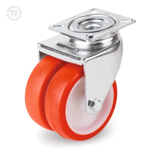 Supporto costituito da piastra, anello tenuta sfere e forcella in lamiera di acciaio zincato elettroliticamente; organo di rotazione formato da due giri sfere lubrificati a grasso, protetti dalla particolare configurazione della piastra di fissaggio. Perno centrale integrale con la piastra ottenuto da stampaggio ed assemblato per ribaditura.