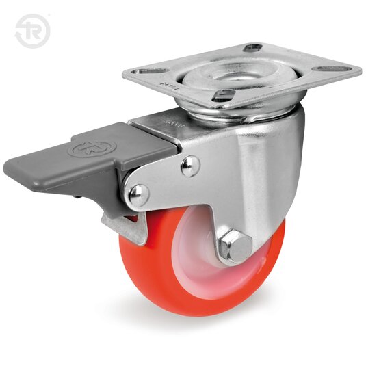 Supporto costituito da piastra, anello tenuta sfere e forcella in lamiera di acciaio zincato elettroliticamente; organo di rotazione formato da due giri sfere lubrificati a grasso, protetti dalla particolare configurazione della piastra di fissaggio. Perno centrale di acciaio stampato assemblato per ribaditura. Il freno anteriore consente il bloccaggio del supporto e della ruota.