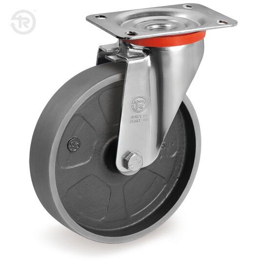 Supporto costituito da piastra, anello tenuta sfere e forcella in lamiera di acciaio zincato elettroliticamente; organo di rotazione formato da due giri sfere lubrificati a grasso e protezione con anello parapolvere in polietilene. Perno centrale integrale con la piastra ottenuto da stampaggio ed assemblato per ribaditura.